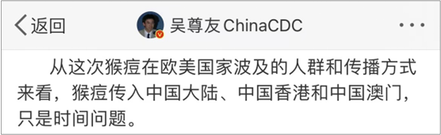 但早在 7 月底,疾控首席專家吳尊友就發(fā)文提醒——猴痘傳入我國大陸及港澳地區(qū)只是時間問題。