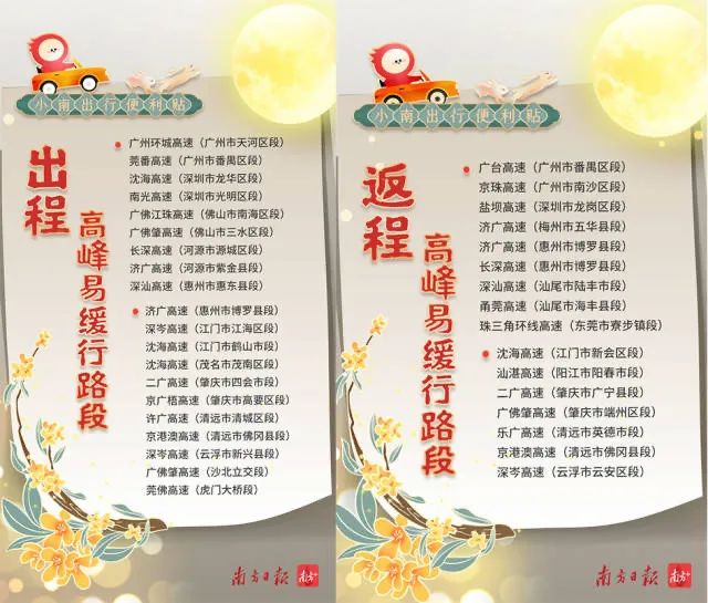 中秋小長(zhǎng)假出程及返程高峰易緩行路段 來源:廣東交警