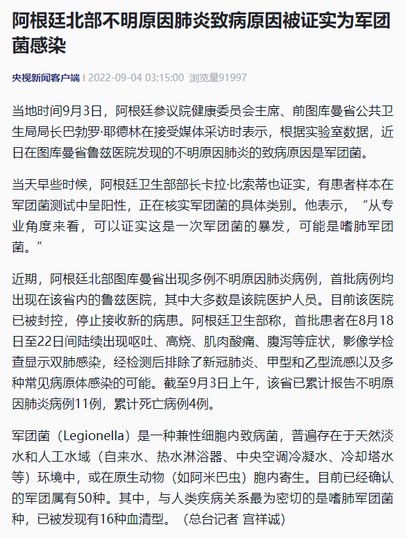 阿根廷不明原因肺炎首批病例持續(xù)至今已半月有余。當(dāng)?shù)貢r(shí)間9月3日,阿根廷參議院健康委員會(huì)主席、前圖庫曼省公共衛(wèi)生局局長巴勃羅·耶德林在接受媒體采訪時(shí)表示,根據(jù)實(shí)驗(yàn)室數(shù)據(jù),近日在圖庫曼省魯茲醫(yī)院發(fā)現(xiàn)的不明原因肺炎的致病原因是軍團(tuán)菌。