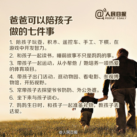 英國紐卡斯?fàn)柎髮W(xué)的研究者,曾對17000個(gè)嬰兒進(jìn)行了11年的跟蹤調(diào)查。結(jié)果表明:經(jīng)常與父親相處的孩子,往往更聰明,精力更旺盛,也更善于交際。教育孩子,并沒有什么高明的技巧,不過就是愛與陪伴。不要以為這些小事無足輕重,那關(guān)系著孩子一輩子的幸福與前途。
