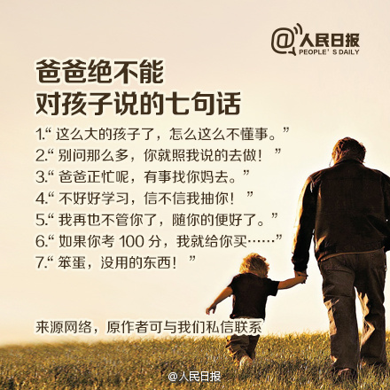 同樣一句話,如果由爸爸說出來,對孩子的影響力是媽媽的50倍。你若給孩子的是打擊、是批評、是指責(zé),孩子注定一路滿是荊棘與黑暗。你若給孩子的是鼓勵(lì)、是贊揚(yáng)、是肯定,孩子往往一路收獲鮮花和光明。有人說,中國最需要教育的,不是孩子而是父母,尤其是爸爸。生了孩子,你就不能“退貨”。做了父親,你就必須得負(fù)責(zé)到底。一個(gè)好父親,會(huì)努力栽培自己做兒女的榜樣。