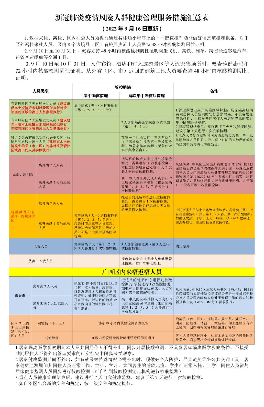 請9月11日(含)以來有博白縣旅居史的人員,來梧前至少提前48小時向目的地社區(qū)(村、屯)報備,在抵達(dá)目的地后12小時內(nèi)向目的地社區(qū)(村、屯)報告,并須在3天內(nèi)完成2次核酸檢測(第1、3天各進(jìn)行一次),核酸檢測結(jié)果出來之前須進(jìn)行居家健康監(jiān)測(無居家健康監(jiān)測條件的須進(jìn)行集中健康監(jiān)測)。如博白縣有風(fēng)險區(qū)調(diào)整,須按照相應(yīng)風(fēng)險區(qū)流出人員管控措施進(jìn)行管控。