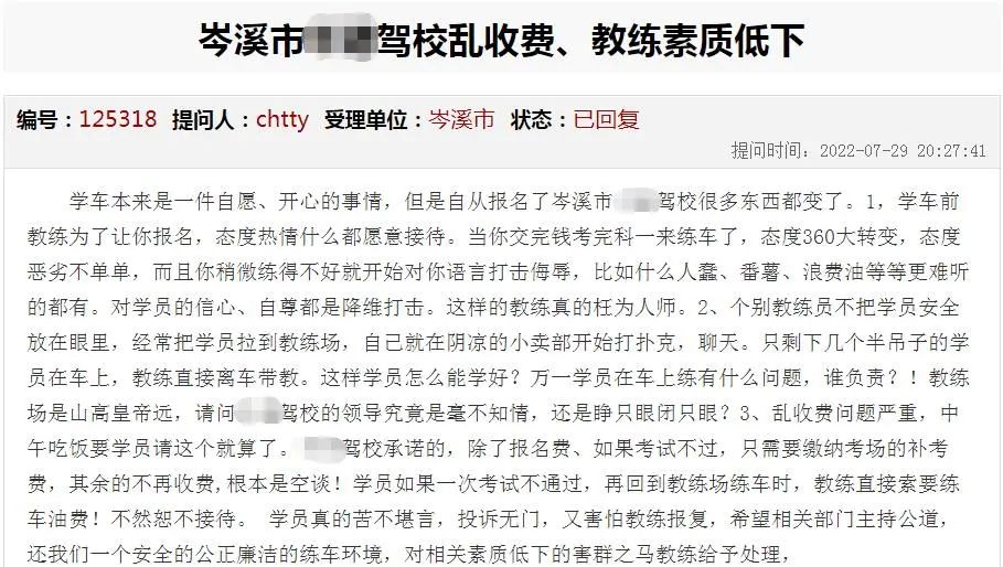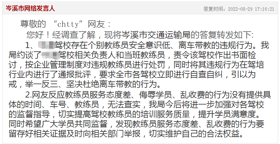 2.網(wǎng)友反應(yīng)教練員服務(wù)態(tài)度差、侮辱學(xué)員、亂收費(fèi)的行為沒(méi)有提供具體的時(shí)間、車(chē)號(hào)、教練員,無(wú)法查實(shí),我局今后將進(jìn)一步加強(qiáng)對(duì)各駕校的監(jiān)督指導(dǎo),切實(shí)提高駕校教練員的培訓(xùn)服務(wù)質(zhì)量,提升學(xué)員滿(mǎn)意度。同時(shí)希望廣大學(xué)員共同監(jiān)督,發(fā)現(xiàn)教練員服務(wù)態(tài)度差、亂收費(fèi)的行為要留存好相關(guān)證據(jù)及時(shí)向相關(guān)部門(mén)舉報(bào),切實(shí)維護(hù)自己的合法權(quán)益。