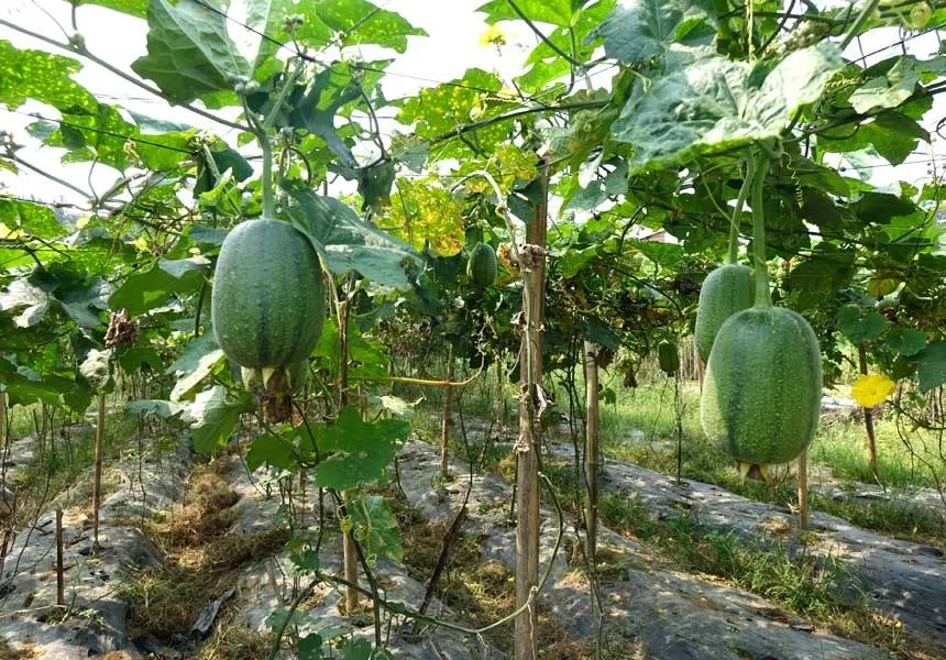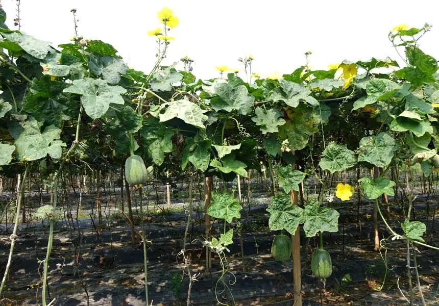 ▲果實(shí)掛滿藤蔓南沙蘋果絲瓜種植基地景觀