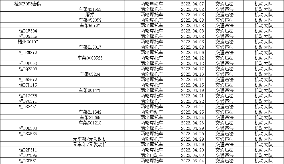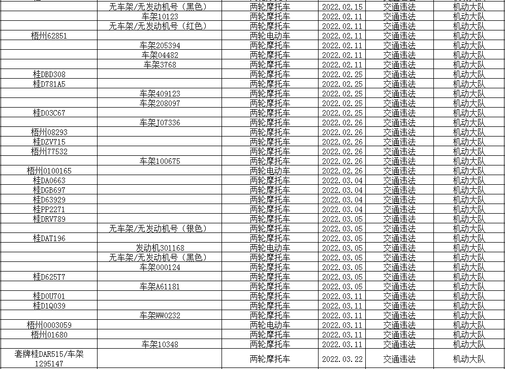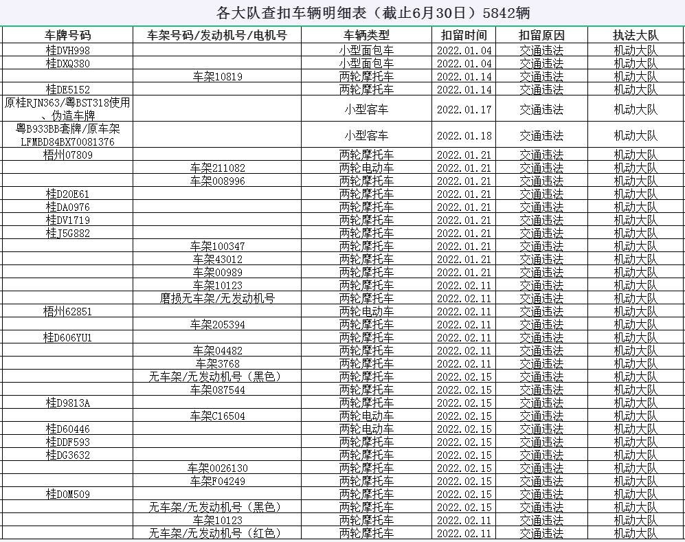 因交通違法或交通肇事,梧州市公安局交通警察支隊(duì)在2022年6月30日前依法查扣了一批車輛(共5842輛,車輛信息詳情請登錄“廣西梧州交警”微信公眾號查詢),其駕駛?cè)嘶蛩腥擞馄谖唇邮芴幚?,現(xiàn)予公告。請車輛駕駛?cè)嘶蛩腥藬y帶車輛的合法證明等有效證件及相關(guān)憑證到有關(guān)交警大隊(duì)接受處理。自公告之日起三個(gè)月內(nèi)仍不接受處理的,我支隊(duì)將根據(jù)《中華人民共和國道路交通安全法》第一百一十二條及《中華人民共和國道路交通安全法實(shí)施條例》第一百零七條之規(guī)定,依法進(jìn)行處理。