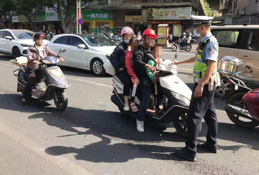 10月30日上午10時(shí)許,梧州市公安局交警支隊(duì)萬秀大隊(duì)在轄區(qū)開展道路交通秩序整治時(shí),查獲了一起號(hào)牌為桂D3***9的二輪摩托車超員案例。車上共載4人,整車駕乘人員非常擁擠,其中兩名兒童并未佩戴安全頭盔,一名兒童站立在摩托車的前踏板上,沒有任何的固定保護(hù)措施,也不抓扶車身任何部位,存在嚴(yán)重的安全隱患,一旦發(fā)生緊急情況,孩子的處境非常危險(xiǎn)。執(zhí)勤警員立即攔停該車,并進(jìn)行嚴(yán)厲批評(píng)教育,讓其出于安全考慮,不要實(shí)行“一車多娃”,隨后,民警依法對(duì)駕駛?cè)斯匙鞒鱿鄳?yīng)的處罰決定。