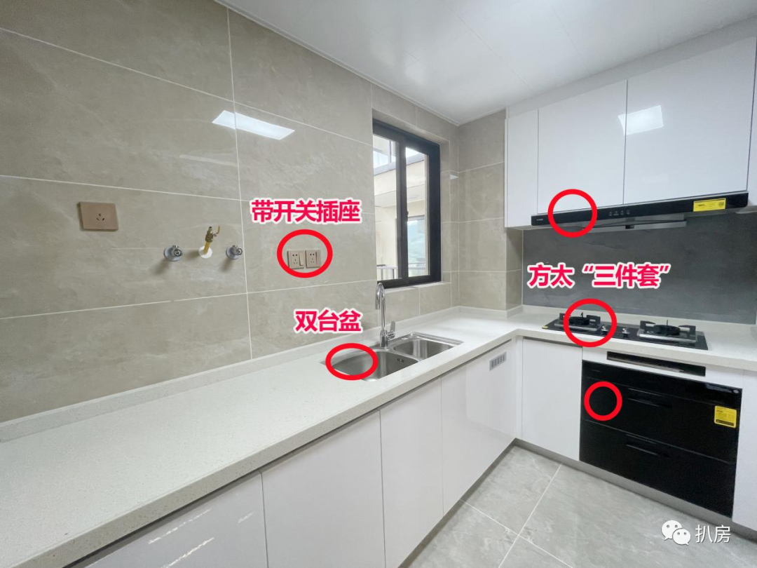 ▲廚房方太“三件套”交付,插座帶開關(guān),油煙擋板使得整面瓷磚方便清潔。