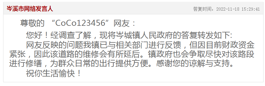 網(wǎng)友反映的問(wèn)題我鎮(zhèn)已與相關(guān)部門(mén)進(jìn)行反饋,但因目前財(cái)政資金緊張,因此該道路的維修會(huì)有所延后。鎮(zhèn)政府也會(huì)爭(zhēng)取盡快對(duì)該路段進(jìn)行修繕,為群眾日常的出行提供方便。感謝您的諒解與支持。