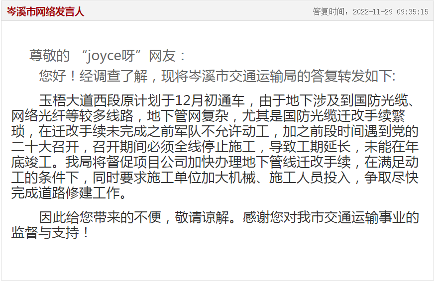 玉梧大道西段原計劃于12月初通車,由于地下涉及到國防光纜、網(wǎng)絡(luò)光纖等較多線路,地下管網(wǎng)復(fù)雜,尤其是國防光纜遷改手續(xù)繁瑣,在遷改手續(xù)未完成之前軍隊不允許動工,加之前段時間遇到黨的二十大召開,召開期間必須全線停止施工,導(dǎo)致工期延長,未能在年底竣工。