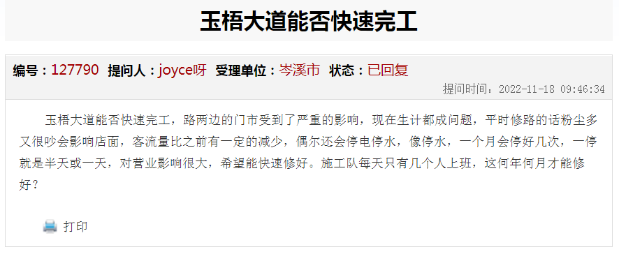 玉梧大道能否快速完工,路兩邊的門市受到了嚴(yán)重的影響,現(xiàn)在生計都成問題,平時修路的話粉塵多又很吵會影響店面,客流量比之前有一定的減少,偶爾還會停電停水,像停水,一個月會停好幾次,一停就是半天或一天,對營業(yè)影響很大,希望能快速修好。施工隊每天只有幾個人上班,這何年何月才能修好?