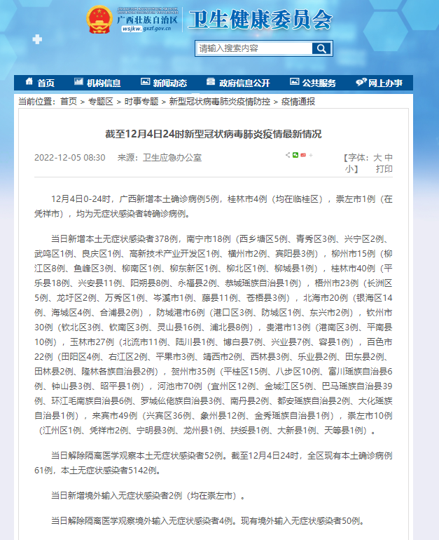 12月4日0-24時(shí),廣西新增本土確診病例5例,桂林市4例(均在臨桂區(qū)),崇左市1例(在憑祥市),均為無癥狀感染者轉(zhuǎn)確診病例。