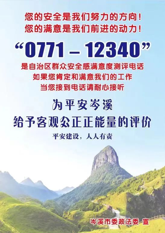 第四季度群眾安全感滿意度民意調(diào)查從12月1日開始,如果您及您的家人接到“0771-12340”民調(diào)電話,請您耐心接聽,客觀公正理性回答調(diào)查問題,回答治安狀況。守護(hù)平安,需要您的參與。你們安全和滿意的回答,將是我們奮力拼搏、開拓前進(jìn)的精神動力!