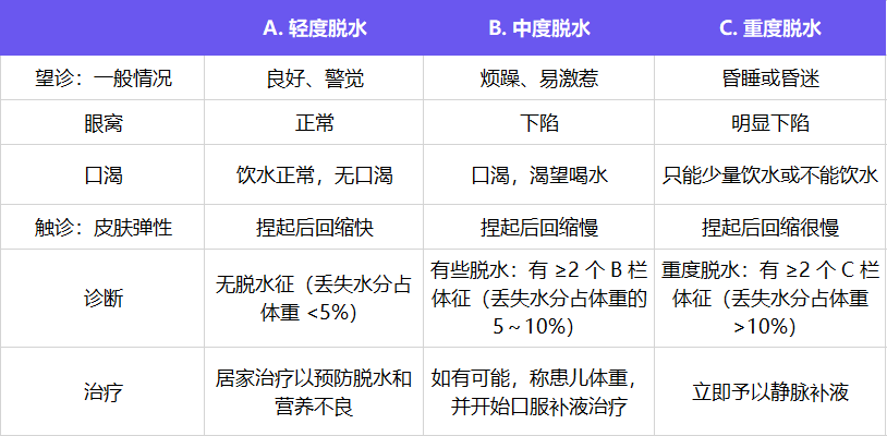 拒食或喂養(yǎng)困難,有脫水表現(xiàn),精神差、運(yùn)動(dòng)減少、眼眶凹陷、皮膚松弛、口唇干燥、哭時(shí)無(wú)淚、尿量減少或無(wú)尿等