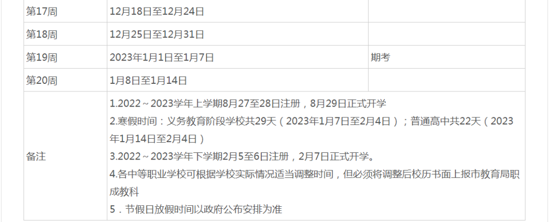 根據(jù)校歷安排,各縣市區(qū)初中、幼兒園的寒假時間共29天,為2023年1月7日至2月4日;普通高中寒假共22天,為2023年1月14日至2月4日。