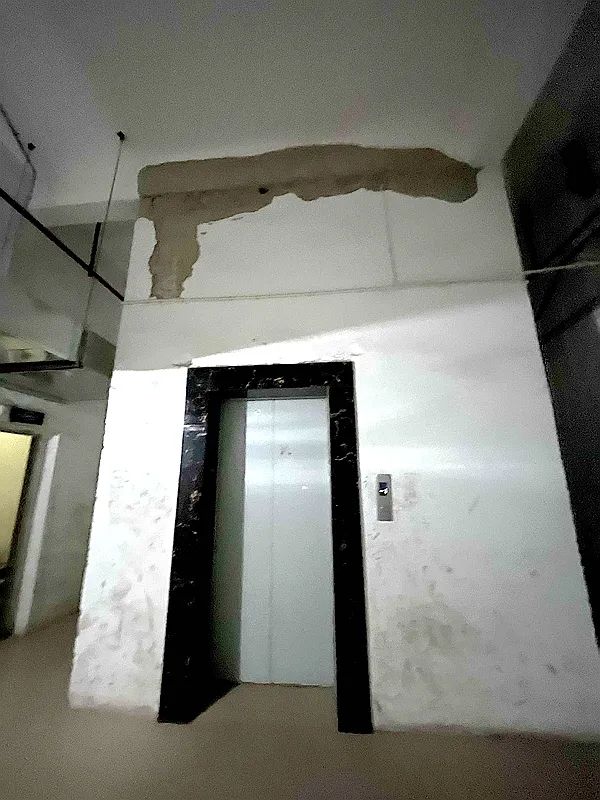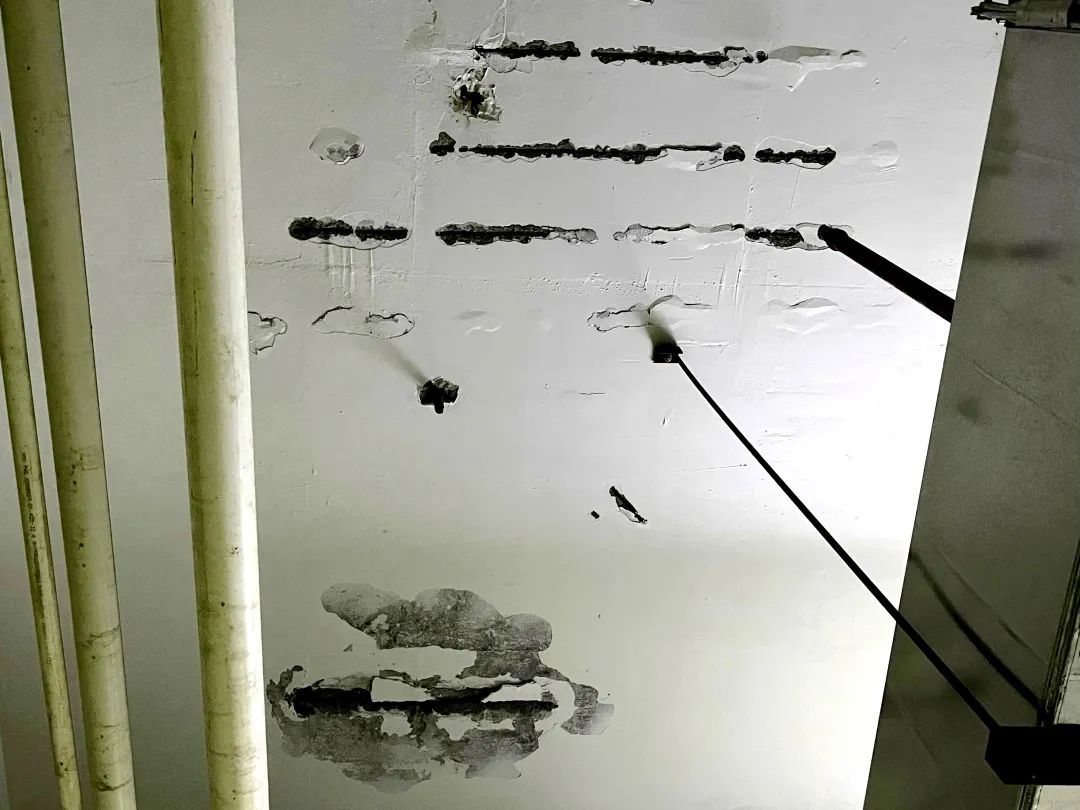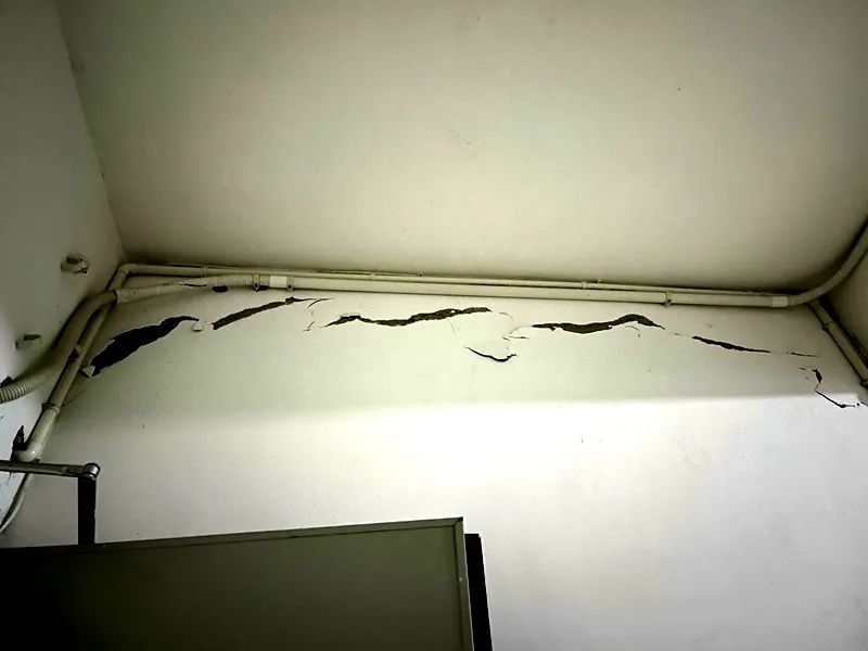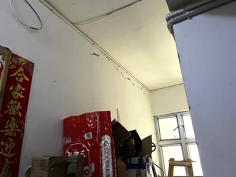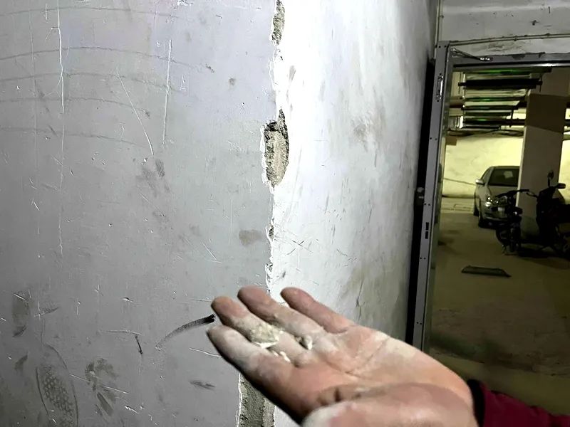 隨后,零妹走進負一層的電梯間。在電梯間上方,零妹看到有大片區(qū)域的墻面剝離,露出水泥面。在樓道內,邱先生向零妹現(xiàn)場演示,他用手在一處墻面稍稍用力就剝離下一塊白色墻面。在邱先生居住的樓層,樓道間的墻面有開裂痕跡。