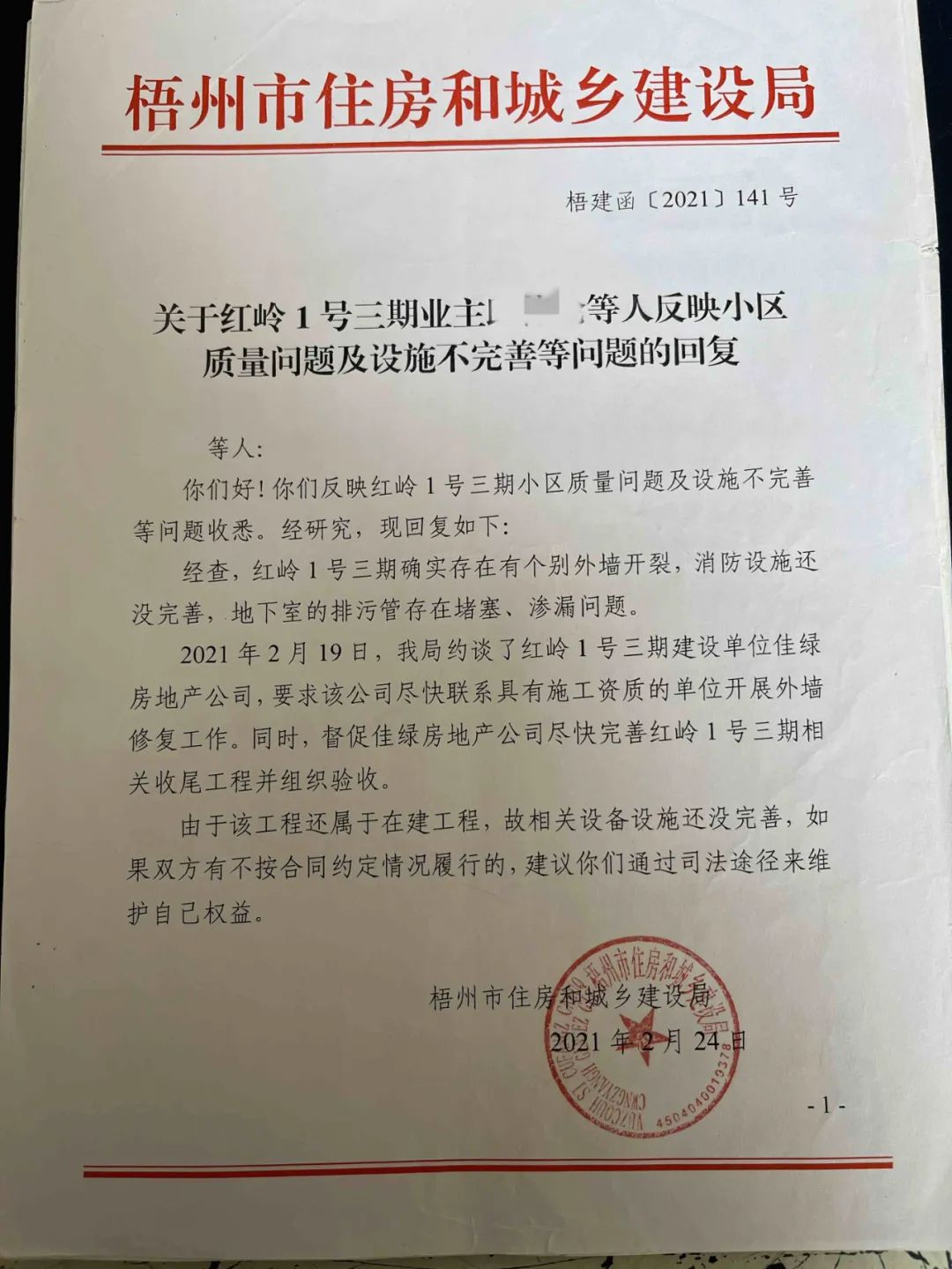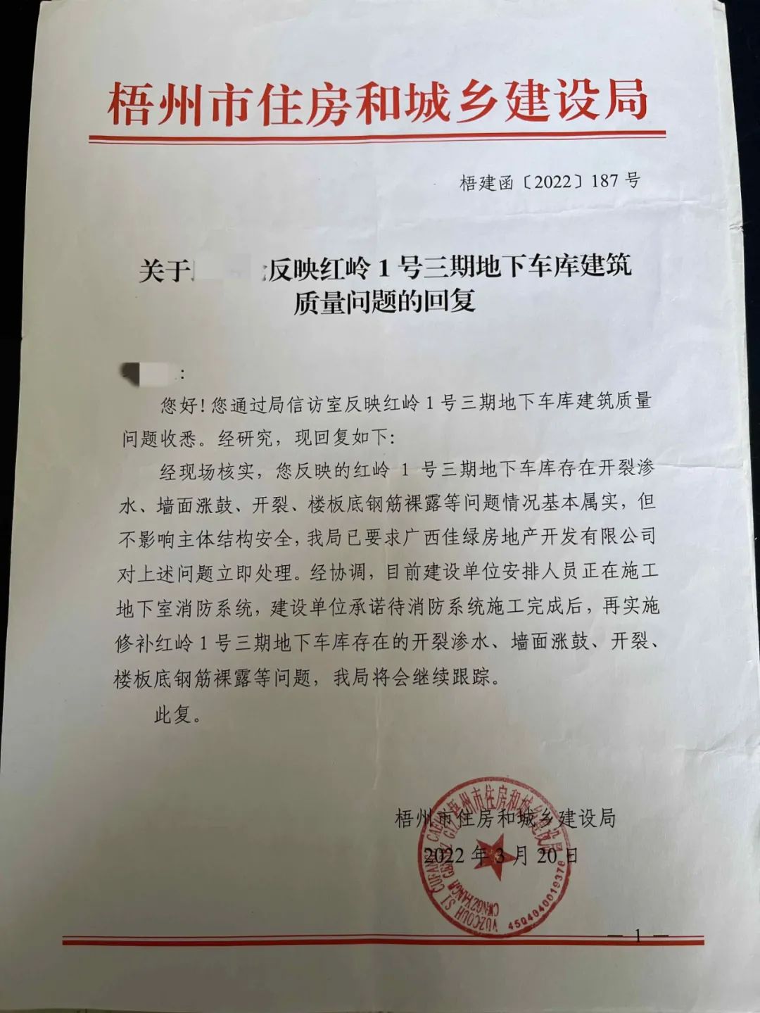 近日,家住梧州市紅嶺1號三期的市民邱先生向本網(wǎng)反映,該小區(qū)存在墻面開裂剝離、地下車庫滲水等問題,希望小區(qū)物管和開發(fā)商方面盡快處理,還業(yè)主一個舒心的居住環(huán)境。