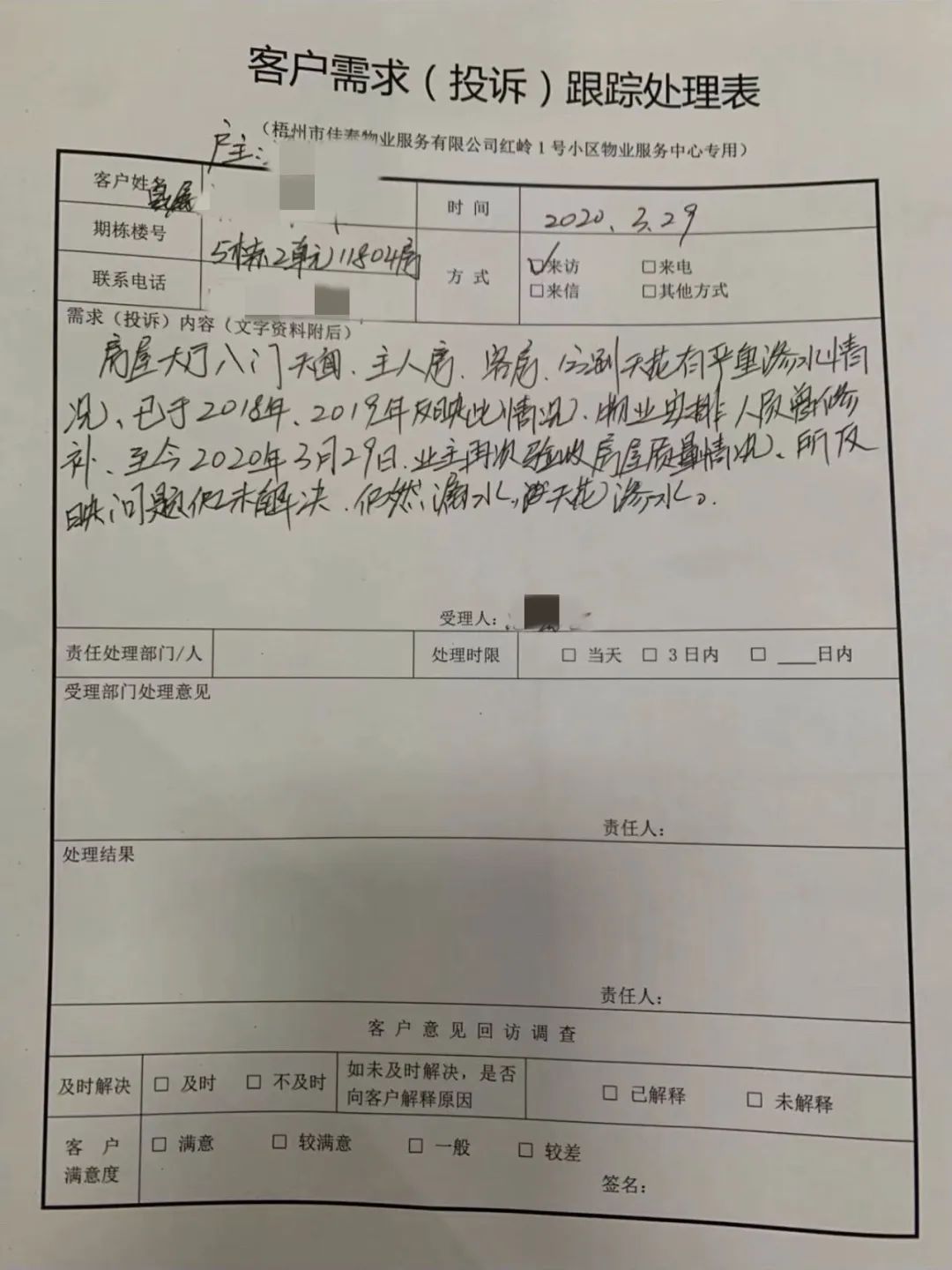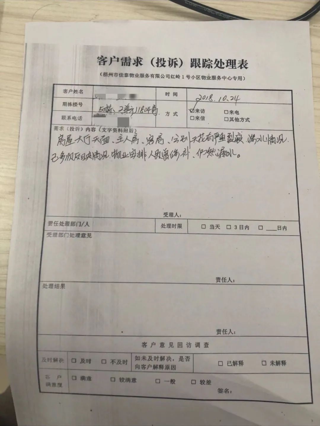 隨后,零妹來到該小區(qū)的物業(yè)管理處,試圖向工作人員了解情況。等待采訪的過程中,零妹看到有一名業(yè)主前來反映房屋質量問題。