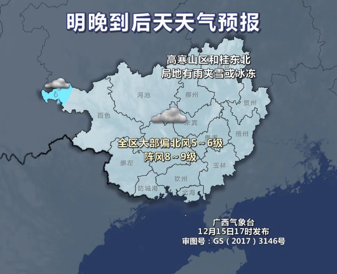 12月16—17日,強(qiáng)冷空氣自北向南影響,全區(qū)多云間陰,其中桂西北局地有小雨,高寒山區(qū)和桂東北局地有冰凍。最低氣溫:高寒山區(qū)-6℃~- 1℃,桂東北0℃~4℃,桂南7℃~11℃,其他地區(qū)4℃~7℃。冷空氣過(guò)境時(shí),全區(qū)大部地區(qū)有5~6 級(jí)、陣風(fēng)7~8 級(jí)的偏北風(fēng)。