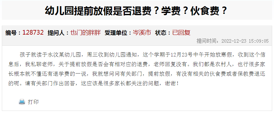 孩子就讀于水汶某幼兒園,周三收到幼兒園通知,這個(gè)學(xué)期于12月23號(hào)中午開始放寒假,收到這個(gè)信息后,我私聊老師,關(guān)于提前放假是否會(huì)有相對(duì)應(yīng)的退費(fèi),老師回復(fù)沒有。我們都是農(nóng)村人,也行很多家長(zhǎng)根本就不懂還有退學(xué)費(fèi)的一說,我就想問問有關(guān)部門,提前放假,有沒有相關(guān)的伙食費(fèi)或者保教費(fèi)退還的呢。請(qǐng)有關(guān)部門作出回答,這應(yīng)該是很多家長(zhǎng)都關(guān)注的問題,謝謝!
