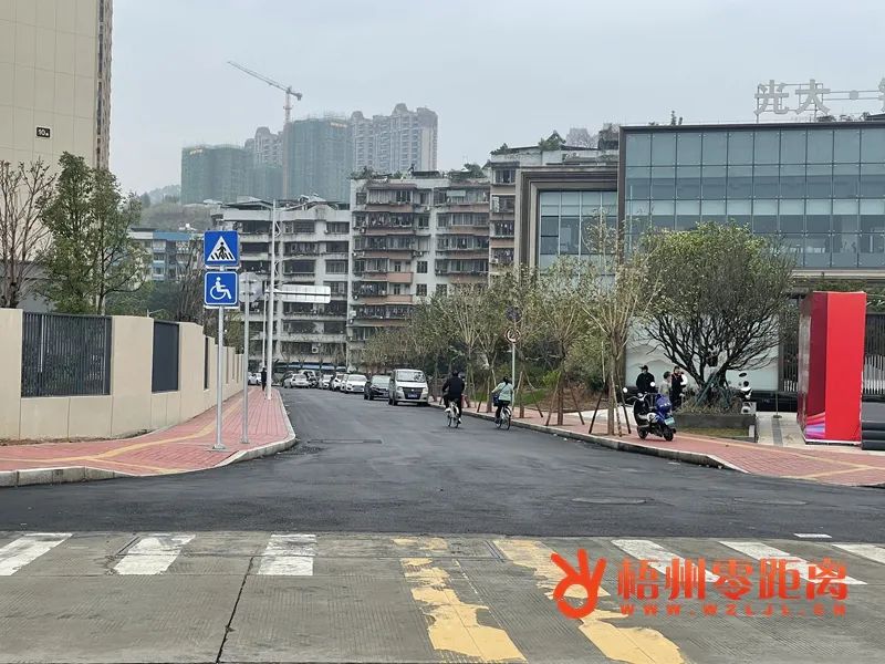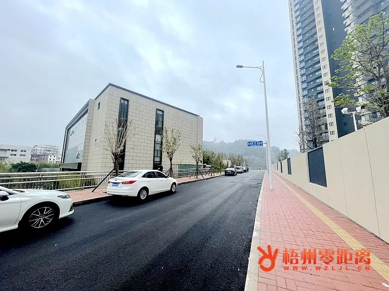 今天(2月9日)上午,零妹來到現(xiàn)場看到,該條新貫通的市政道路路口位于梧州市富民路富民社區(qū)黨群服務中心及匯豪公館之間,連通至鴛江路。道路新鋪設(shè)瀝青路面,兩側(cè)安裝有嶄新的路燈,已有不少車輛和行人在道路上通行。