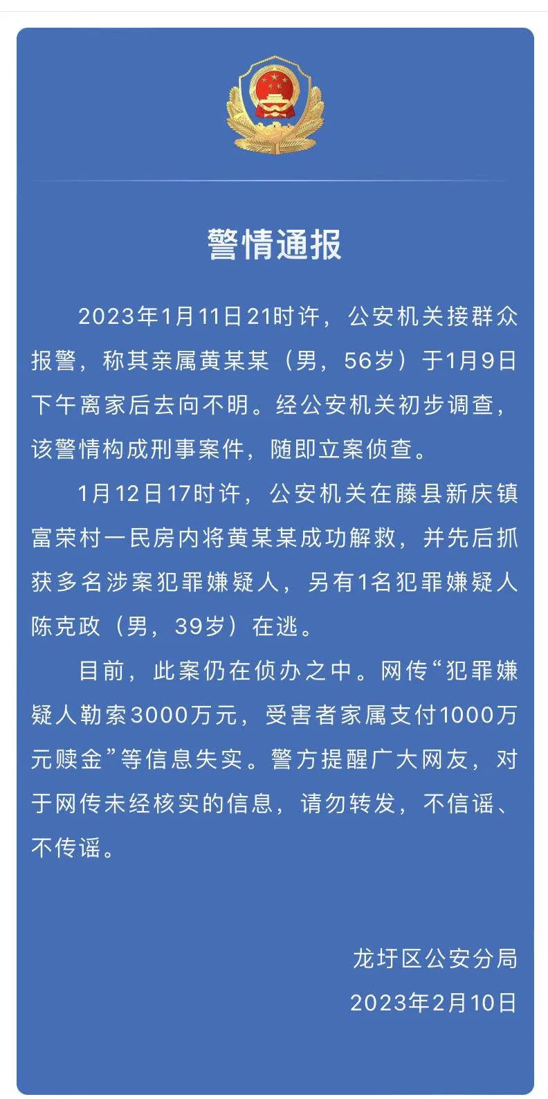【中國(guó)新聞網(wǎng)2月10日訊】據(jù)澎湃新聞報(bào)道,1月9日,廣西梧州市供銷合作社聯(lián)合社黨組書(shū)記、理事會(huì)主任黃東明,被藤縣富榮村村民陳克政等人綁架。1月12日,警方將其解救。公開(kāi)信息顯示,黃東明曾任藤縣縣委書(shū)記5年,2021年6月調(diào)離藤縣。