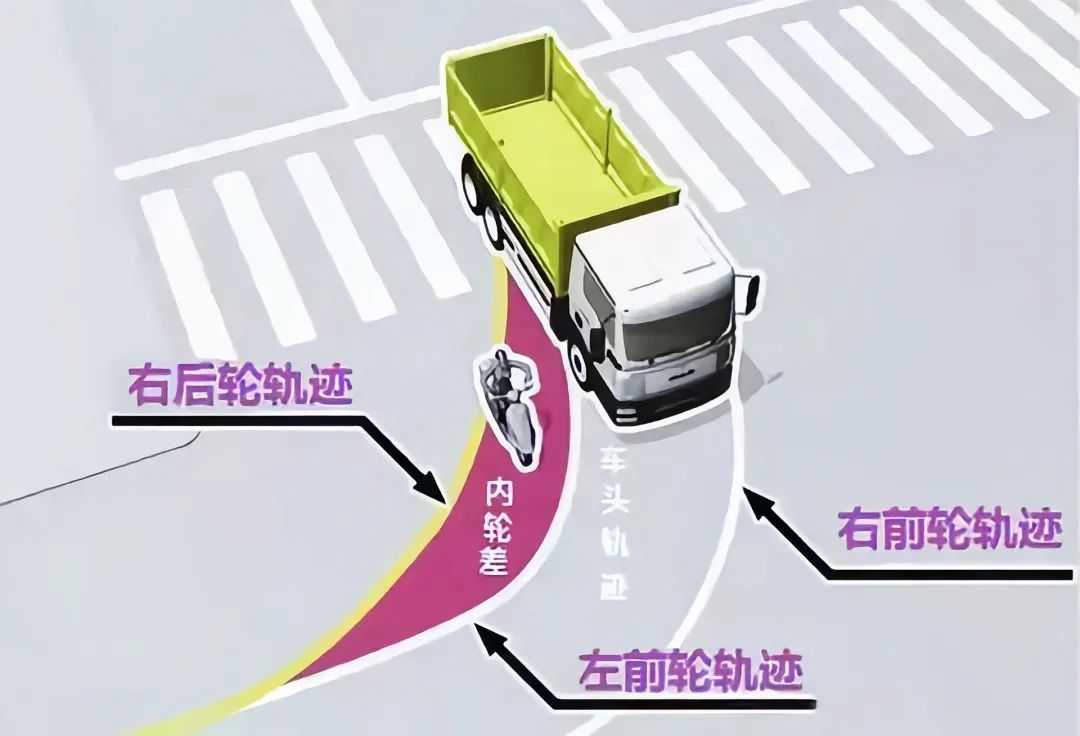 三、大貨車行駛時(shí)存在內(nèi)輪差。汽車在轉(zhuǎn)彎時(shí),后輪并不是完全沿著前輪的軌跡行駛的,前內(nèi)輪轉(zhuǎn)彎半徑與后內(nèi)輪轉(zhuǎn)彎半徑之間存在一些差值,而且車身越長“內(nèi)輪差”就越明顯。這樣導(dǎo)致的結(jié)果就是:當(dāng)貨車司機(jī)在十字路口改變方向行駛時(shí),經(jīng)常會無意中碾壓到行人或騎自行車的人。
