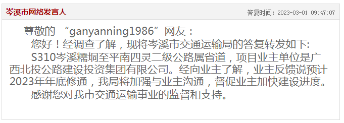 S310岑溪糯垌至平南四靈二級公路屬省道,項目業(yè)主單位是廣西北投公路建設(shè)投資集團有限公司。經(jīng)向業(yè)主了解,業(yè)主反饋說預(yù)計2023年年底修通,我局將加強與業(yè)主溝通,督促業(yè)主加快建設(shè)進度。