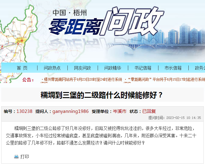 經(jīng)濟振興,交通先行;交通事關(guān)出行,也是民生重點之一。近日,有網(wǎng)友問及糯垌至三堡的二級路(即岑溪糯垌至平南四靈二級公路之岑溪段)何時完工?由于長年修路,該路段路況欠佳,晴天則塵土飛揚,雨天則泥濘難行,有磨底盤隱患,有的網(wǎng)友干脆繞行岑城六田或波塘至三堡。