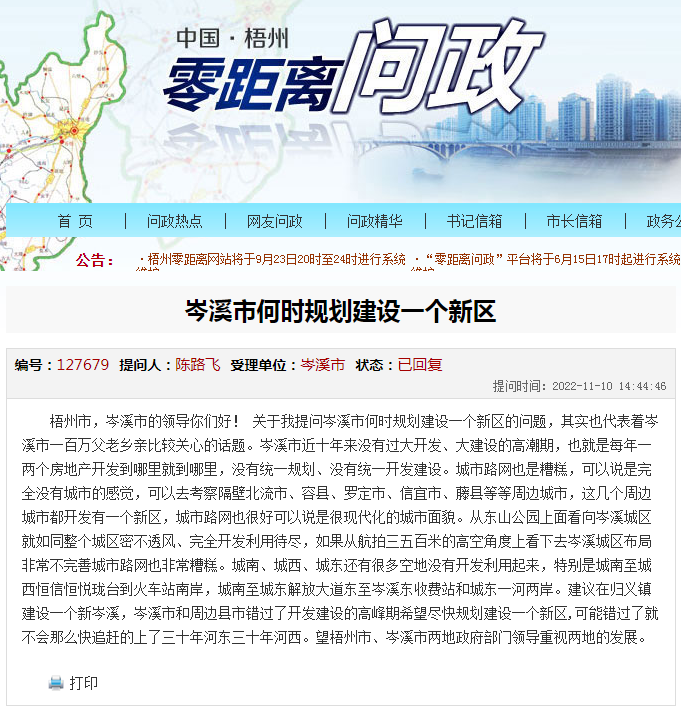 該網(wǎng)友于去年11月份提出,岑溪城市發(fā)展缺少統(tǒng)一規(guī)劃和開發(fā)建設(shè),可以說是完全沒有城市的感覺,像周邊的北流、容縣、羅定、信宜、藤縣等市縣,它們共同點在于都開發(fā)有一個新區(qū),城市路網(wǎng)也很好,體現(xiàn)出了現(xiàn)代化的城市面貌。