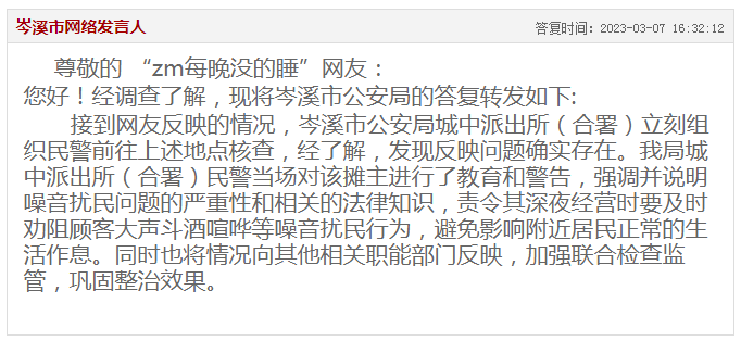 民警當(dāng)場對該攤主進行了教育和警告,責(zé)令其深夜經(jīng)營時要及時勸阻顧客大聲斗酒喧嘩等噪音擾民行為,避免影響附近居民正常的生活作息;同時將和其他相關(guān)職能部門加強聯(lián)合檢查監(jiān)管,鞏固整治效果。