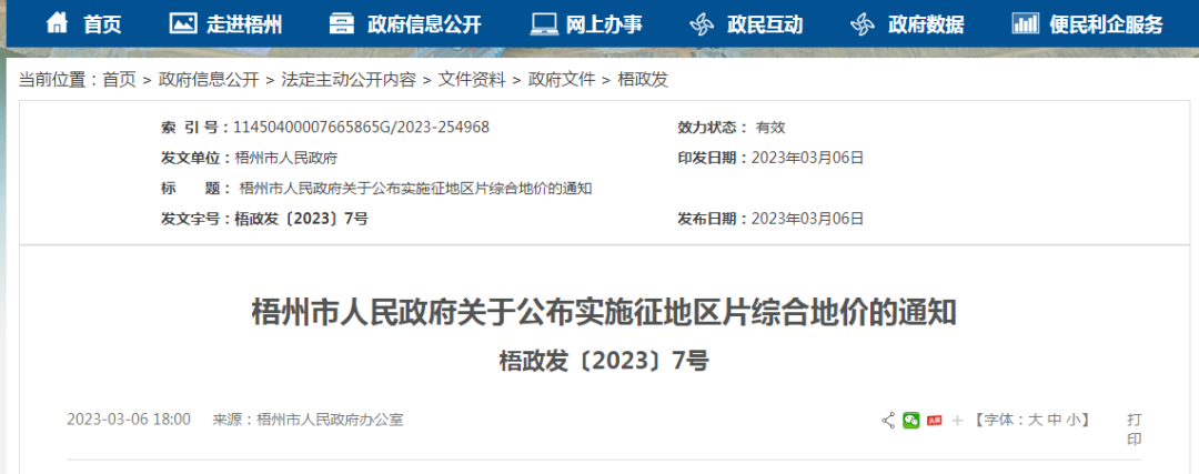 3月6日,梧州市人民政府網(wǎng)站發(fā)布《關(guān)于公布實施征地區(qū)片綜合地價的通知》(梧政發(fā)〔2023〕7號),明確征收農(nóng)用地區(qū)片綜合地價標準適用于全市范圍內(nèi)集體農(nóng)用地(永久基本農(nóng)田除外)的征收補償,并公布了各縣市區(qū)的綜合地價。