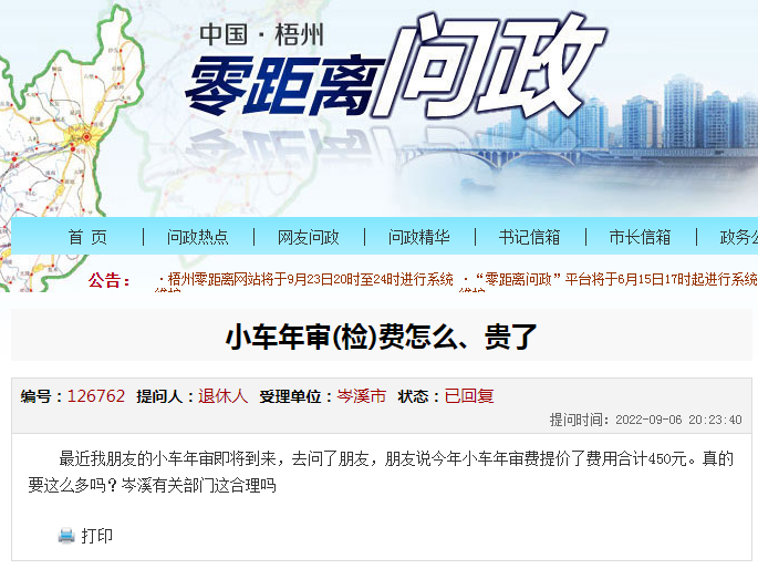 據(jù)網(wǎng)友零距離問(wèn)政反映,岑溪小車年審費(fèi)用提價(jià)了,需要450元,由此質(zhì)疑這收費(fèi)是否合理?