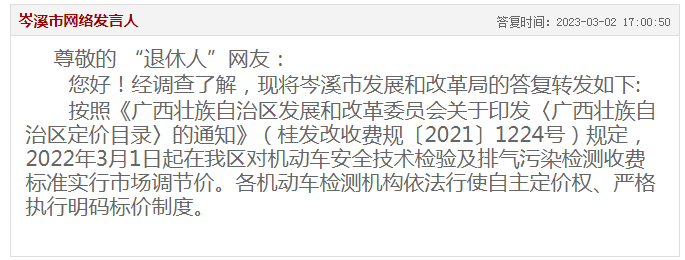 按照《廣西壯族自治區(qū)發(fā)展和改革委員會(huì)關(guān)于印發(fā)〈廣西壯族自治區(qū)定價(jià)目錄〉的通知》(桂發(fā)改收費(fèi)規(guī)〔2021〕1224號(hào))規(guī)定,2022年3月1日起,廣西對(duì)機(jī)動(dòng)車安全技術(shù)檢驗(yàn)及排氣污染檢測(cè)收費(fèi)標(biāo)準(zhǔn)實(shí)行市場(chǎng)調(diào)節(jié)價(jià)。各機(jī)動(dòng)車檢測(cè)機(jī)構(gòu)依法行使自主定價(jià)權(quán)、嚴(yán)格執(zhí)行明碼標(biāo)價(jià)制度。