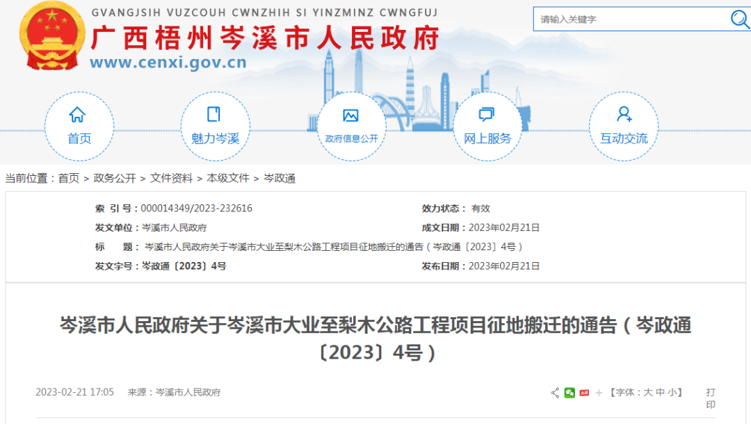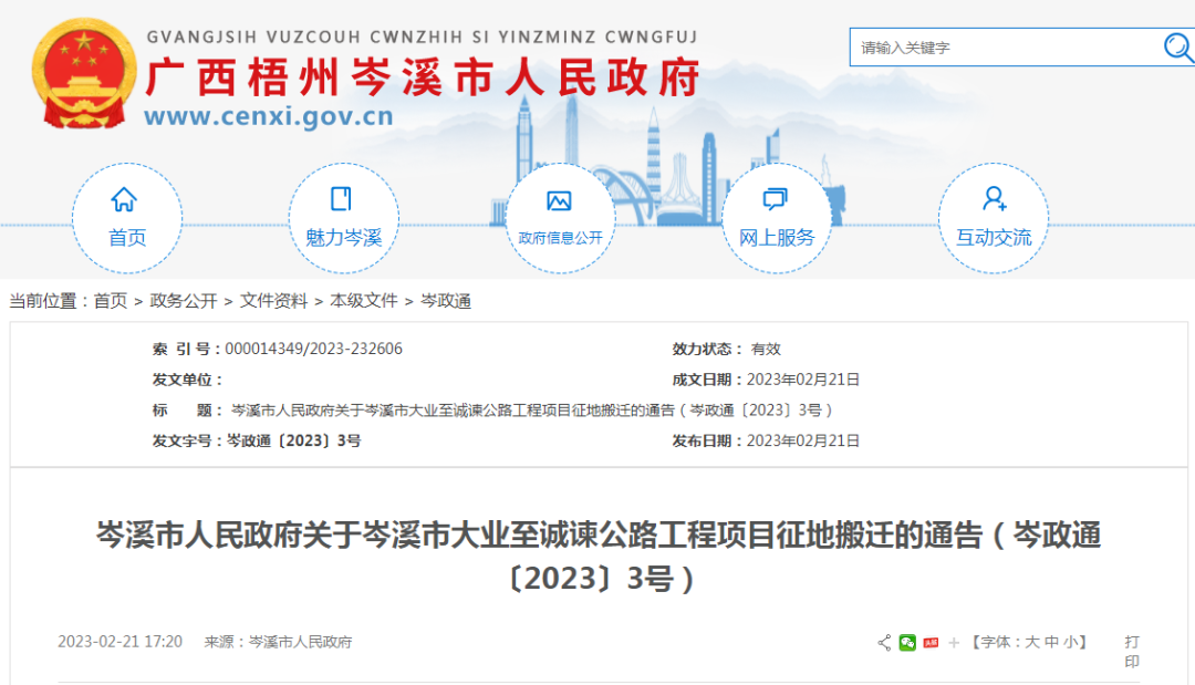 大業(yè)至誠(chéng)諫公路工程項(xiàng)目,起點(diǎn)位于大業(yè)鎮(zhèn)古萬(wàn)村附近,與G324線相交,途經(jīng)六耳咀、大河口、誠(chéng)諫社區(qū)、陀村,終點(diǎn)位于古藏村與龍圩區(qū)廣平鎮(zhèn)交界,順接Y109鄉(xiāng)道。今年2月21日,岑溪市人民政府網(wǎng)站了發(fā)布項(xiàng)目征地搬遷通告(岑政通【2023】3號(hào))。