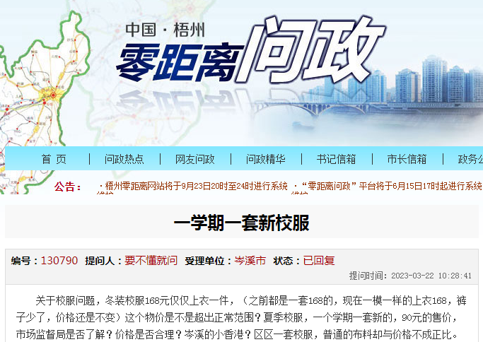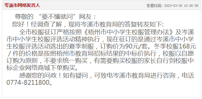 這是一則來(lái)自梧州零距離問(wèn)政的帖子。近期,有網(wǎng)友反映岑溪中小學(xué)校服的問(wèn)題,焦點(diǎn)在于價(jià)格和面料:168元的冬裝校服,此前還是一套的,現(xiàn)在只有上衣,這價(jià)格是否超出正常價(jià)格了?另外,夏季校服每學(xué)期都換新的,每套90元,這價(jià)格是否合理?