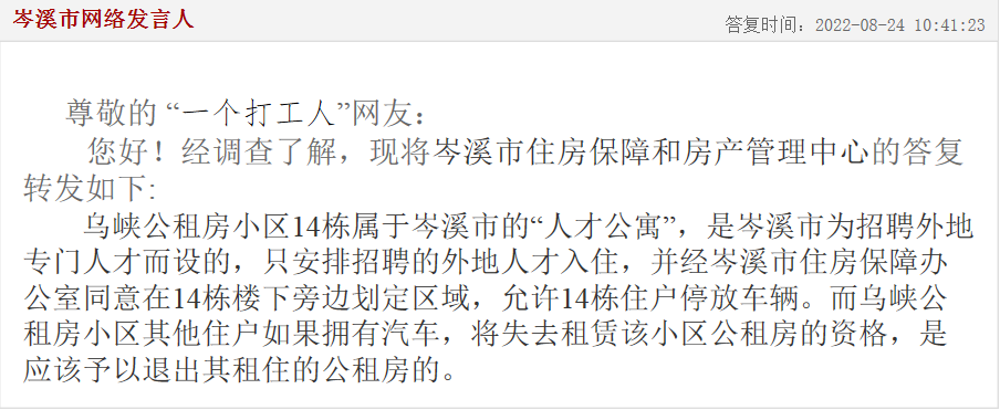 早在2022年8月24日,相關(guān)部門曾給出烏峽公租房小區(qū)相關(guān)規(guī)定:烏峽公租房小區(qū)14棟屬于岑溪市的“人才公寓”,是岑溪市為招聘外地專門人才而設(shè)的,只安排招聘的外地人才入住,并經(jīng)岑溪市住房保障辦公室同意在14棟樓下旁邊劃定區(qū)域,允許14棟住戶停放車輛。