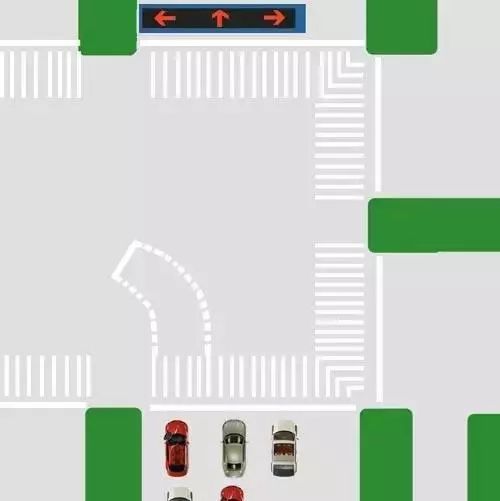 當(dāng)左轉(zhuǎn)彎信號(hào)燈綠燈亮?xí)r,等候在待轉(zhuǎn)區(qū)的車輛應(yīng)迅速通過(guò)路口,如下圖: