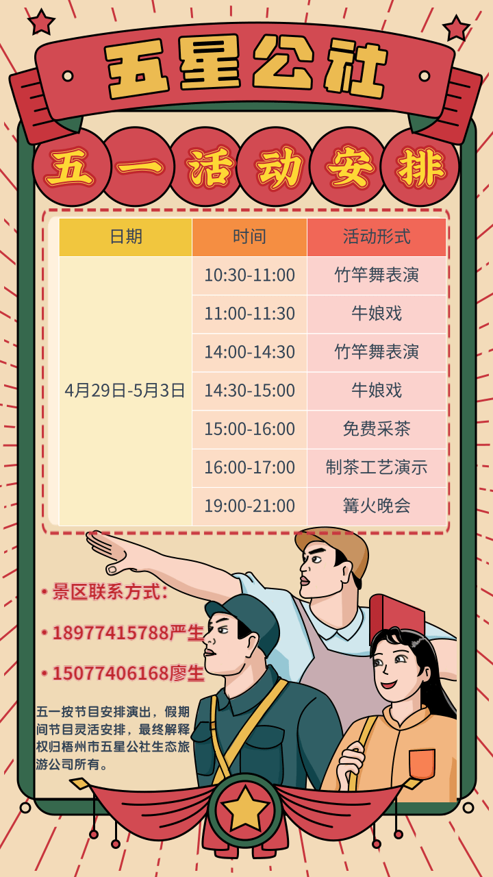 根據(jù)景區(qū)活動(dòng)安排,4月29日-5月3日,五星公社將舉行竹竿舞、牛娘戲、免費(fèi)采茶、制茶工藝演示、篝火晚會(huì)等精彩活動(dòng),演出地點(diǎn)就在景區(qū)內(nèi)的同心文化廣場(chǎng),千萬不要錯(cuò)過了哦!