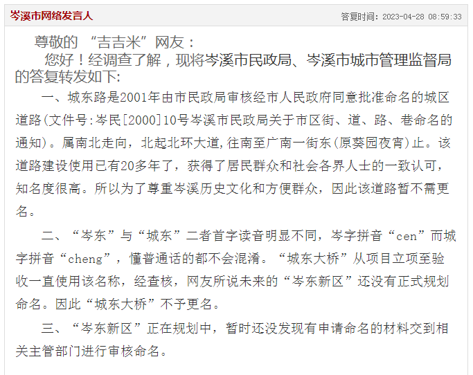 二、“岑東”與“城東”二者首字讀音明顯不同,岑字拼音“cen”而城字拼音“cheng”,懂普通話的都不會混淆。“城東大橋”從項目立項至驗收一直使用該名稱,經(jīng)查核,網(wǎng)友所說未來的“岑東新區(qū)”還沒有正式規(guī)劃命名。因此“城東大橋”不予更名。