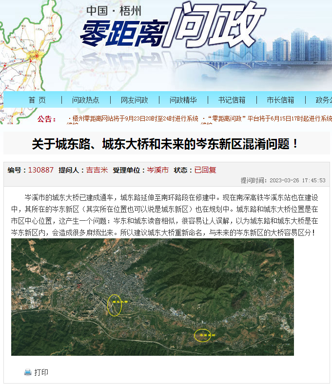 今年3月份的時候,有零距離網(wǎng)友提到岑溪城東大橋已建成通車,城東路延伸至南環(huán)路段在修建中,規(guī)劃屬于岑東新區(qū)的南深高鐵岑溪東站也在建設(shè)中,其中的“城東”與“岑東”讀讀音相似,容易混淆而讓人誤解,由此建議城東大橋重新命名。