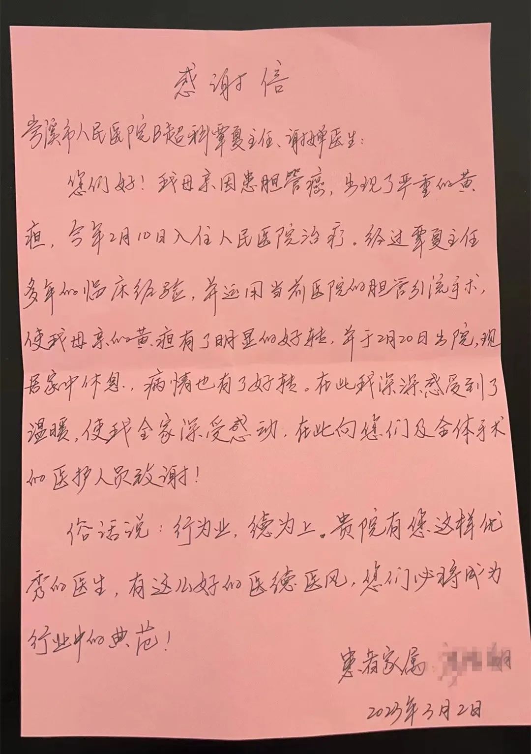 一名患者因膽管癌導(dǎo)致肝內(nèi)膽管堵塞擴(kuò)張成為“小黃人”,在我院超聲科進(jìn)行超聲引導(dǎo)下膽管置管引流術(shù)(PTCD),經(jīng)過治療,病情得到明顯好轉(zhuǎn)。病人家屬為感謝醫(yī)護(hù)人員的精心治療,特地寫了一封感謝信送到超聲科。一封封來自患者的感謝信,對醫(yī)護(hù)人員來說,既是肯定和感激,更是一種鞭策!