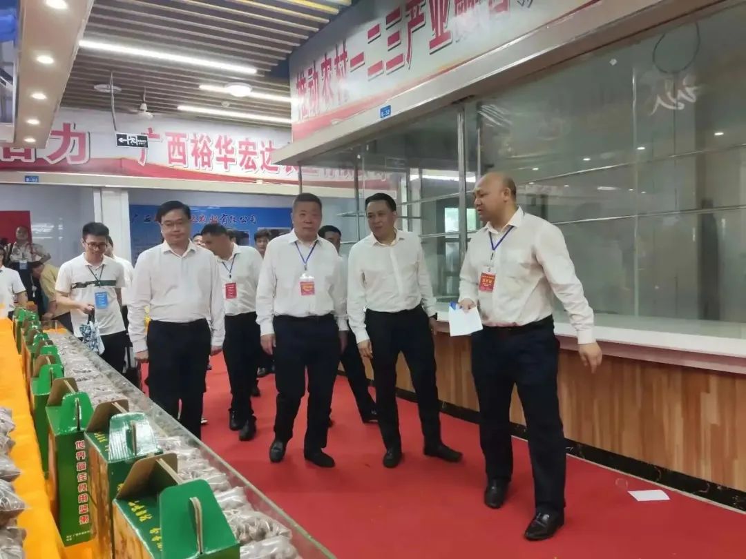 ▲中國石材協(xié)會常務副會長齊子剛,岑溪市委書記羅偉雄,岑溪市委副書記、市長吳偉華等領導嘉賓來到岑城鎮(zhèn)名特優(yōu)農產品展參觀指導。