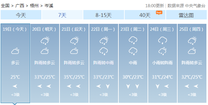 據(jù)岑溪天氣19日預(yù)報(bào),接下來的天氣可謂水火兩重天,一邊高溫,一邊雨天!最高氣溫將飆升至35°C!就問你夠不夠熱?情?