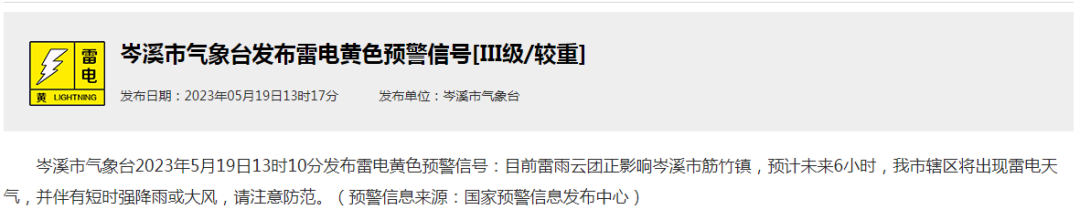 2023年5月19日13時(shí)10分,岑溪市氣象臺(tái)發(fā)布雷電黃色預(yù)警信號(hào):目前雷雨云團(tuán)正影響岑溪市筋竹鎮(zhèn),預(yù)計(jì)未來6小時(shí),我市轄區(qū)將出現(xiàn)雷電天氣,并伴有短時(shí)強(qiáng)降雨或大風(fēng),請(qǐng)注意防范。(預(yù)警信息來源:國家預(yù)警信息發(fā)布中心)