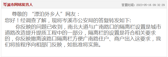 道路隔離防護(hù)欄的作用,在于車輛分流并提高車輛的通行效率和安全性。但是在實(shí)施過程中,也得考慮實(shí)際情況,做到與時(shí)俱進(jìn)、因地制宜。比如岑溪婦幼對面十字路口護(hù)欄問題,據(jù)4月13日零距離問政的答復(fù),該路口的隔離護(hù)欄已撤掉。(詳見《岑溪這條街道的中間隔離護(hù)欄已拆除,原因耐人尋味》)