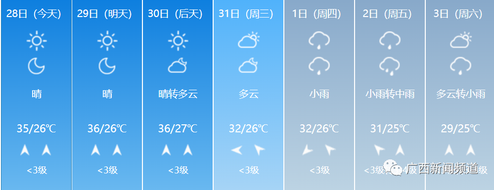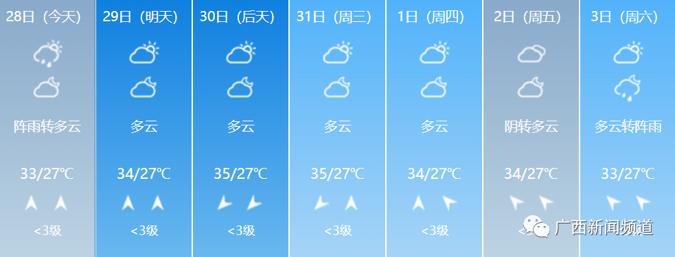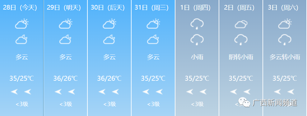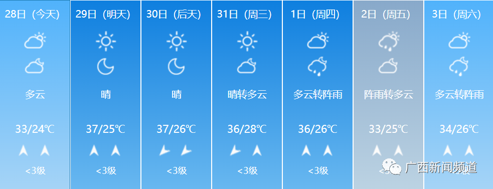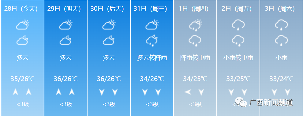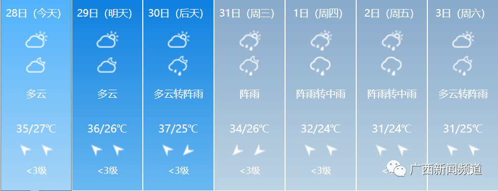 廣西氣象臺(tái)首席預(yù)報(bào)員 董良淼:特別是桂東北這一帶,最高氣溫將會(huì)下降到30℃到34℃。其他地區(qū)就是主要是南部和西部,最高氣溫是略有下降,仍然會(huì)有34℃到36℃,局地37℃。
