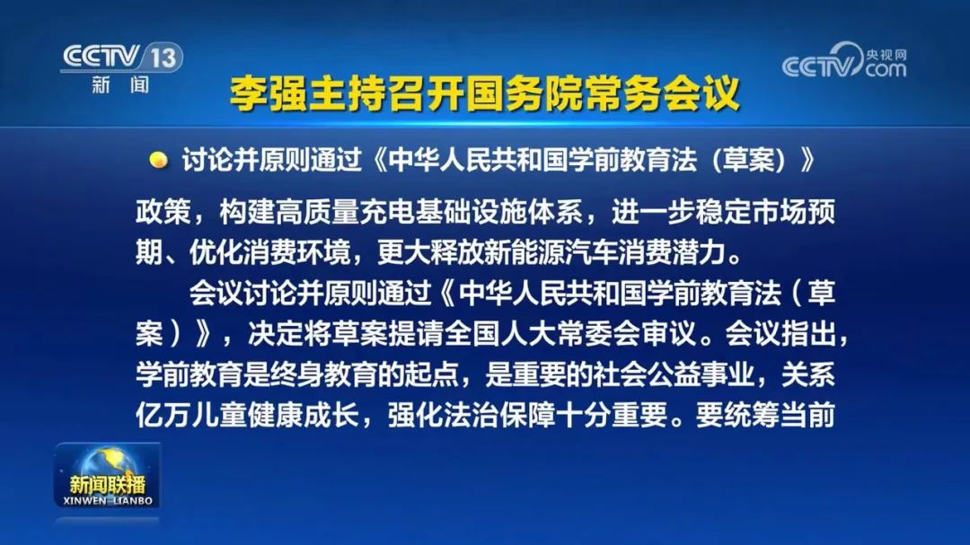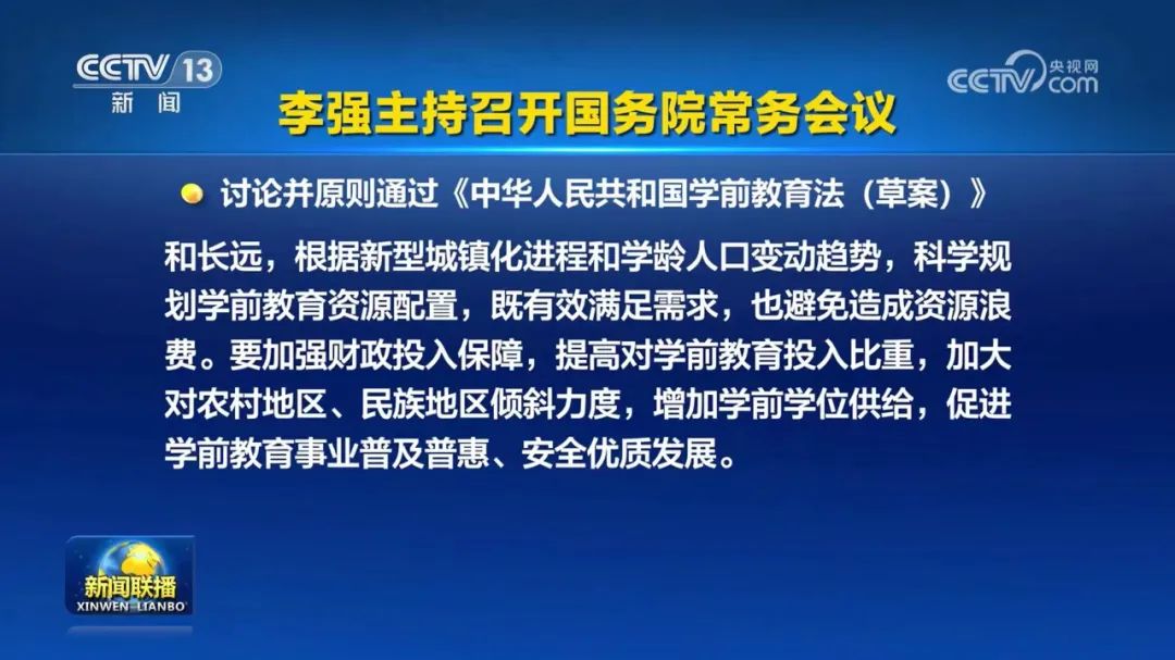 會議討論并原則通過《中華人民共和國學(xué)前教育法(草案)》,決定將草案提請全國人大常委會審議。會議指出,學(xué)前教育是終身教育的起點,是重要的社會公益事業(yè),關(guān)系億萬兒童健康成長,強化法治保障十分重要。要統(tǒng)籌當(dāng)前和長遠,根據(jù)新型城鎮(zhèn)化進程和學(xué)齡人口變動趨勢,科學(xué)規(guī)劃學(xué)前教育資源配置,既有效滿足需求,也避免造成資源浪費。要加強財政投入保障,提高對學(xué)前教育投入比重,加大對農(nóng)村地區(qū)、民族地區(qū)傾斜力度,增加學(xué)前學(xué)位供給,促進學(xué)前教育事業(yè)普及普惠、安全優(yōu)質(zhì)發(fā)展。