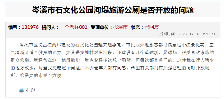 岑溪市區(qū)義昌江兩岸建設(shè)的石文化公園越來(lái)越漂亮,市民或外地旅客都很滿意這個(gè)江景優(yōu)美、空氣清新又適合健身的地方。尤其是龍?zhí)链鍖?duì)出河段,還建設(shè)有幾個(gè)籃球場(chǎng)、足球場(chǎng),很受喜歡鍛煉的群眾歡迎。我經(jīng)常在這一地段散步,我也曾經(jīng)多次想上廁所,但每次都是關(guān)門的,迫使我在行人稀少的地方放水,每當(dāng)我提起這個(gè)問題,不少老年人都有同感。希望有關(guān)部門在加強(qiáng)管理的同時(shí)開放廁所,給需要的市民予方便。