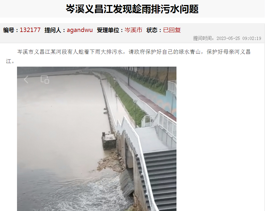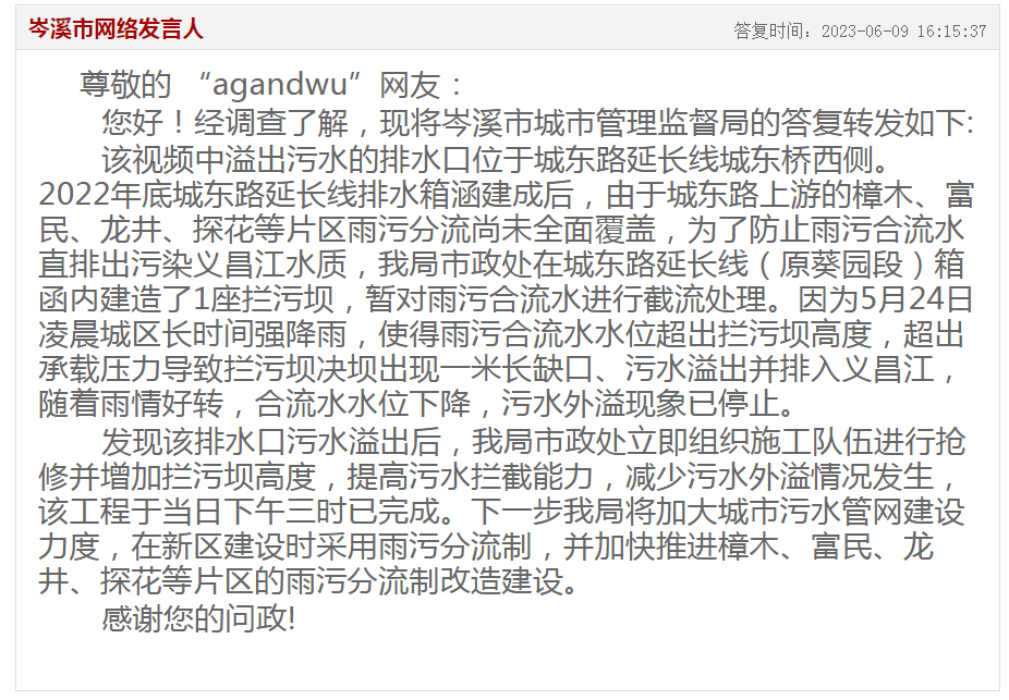 該視頻中溢出污水的排水口位于城東路延長線城東橋西側(cè)。2022年底城東路延長線排水箱涵建成后,由于城東路上游的樟木、富民、龍井、探花等片區(qū)雨污分流尚未全面覆蓋,為了防止雨污合流水直排出污染義昌江水質(zhì),我局市政處在城東路延長線(原葵園段)箱函內(nèi)建造了1座攔污壩,暫對雨污合流水進(jìn)行截流處理。因為5月24日凌晨城區(qū)長時間強(qiáng)降雨,使得雨污合流水水位超出攔污壩高度,超出承載壓力導(dǎo)致攔污壩決壩出現(xiàn)一米長缺口、污水溢出并排入義昌江,隨著雨情好轉(zhuǎn),合流水水位下降,污水外溢現(xiàn)象已停止。