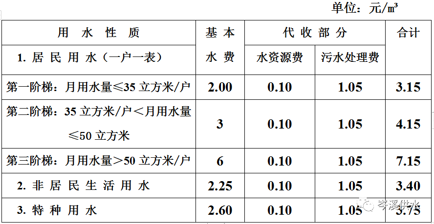 1.表中一戶一表階梯每戶定員人口為5人,超過定員人口的憑房產(chǎn)證和居民常住戶口簿向供水企業(yè)申請,經(jīng)供水企業(yè)核實后,第一階梯每戶月用水量7立方米/人計。每戶人口不超過5人的,月用水量大于35立方米但不超過50立方米的部分執(zhí)行第二階梯水價,超過50立方米的部分執(zhí)行第三階梯水價。